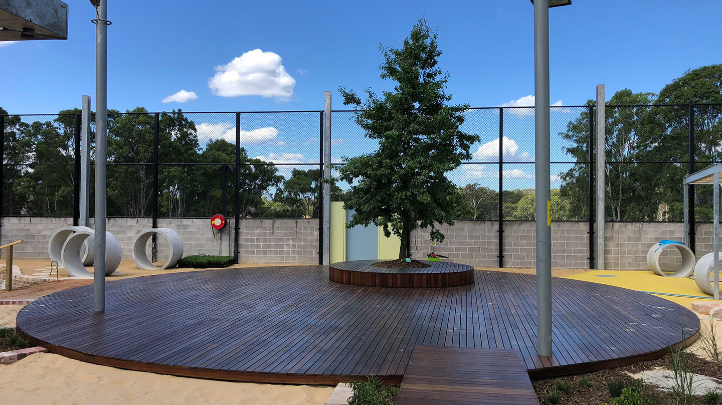 The building includes several rooms for various age groups, reception and lobby area, commercial kitchen, amenities and staff facilities, with custom-built furniture and large windows ensuring a contemporary and light-filled interior. The exterior was extensively landscaped, and a custom curved climbing wall installed along with large overhead sails and a Pin Oak tree to provide sun protection.